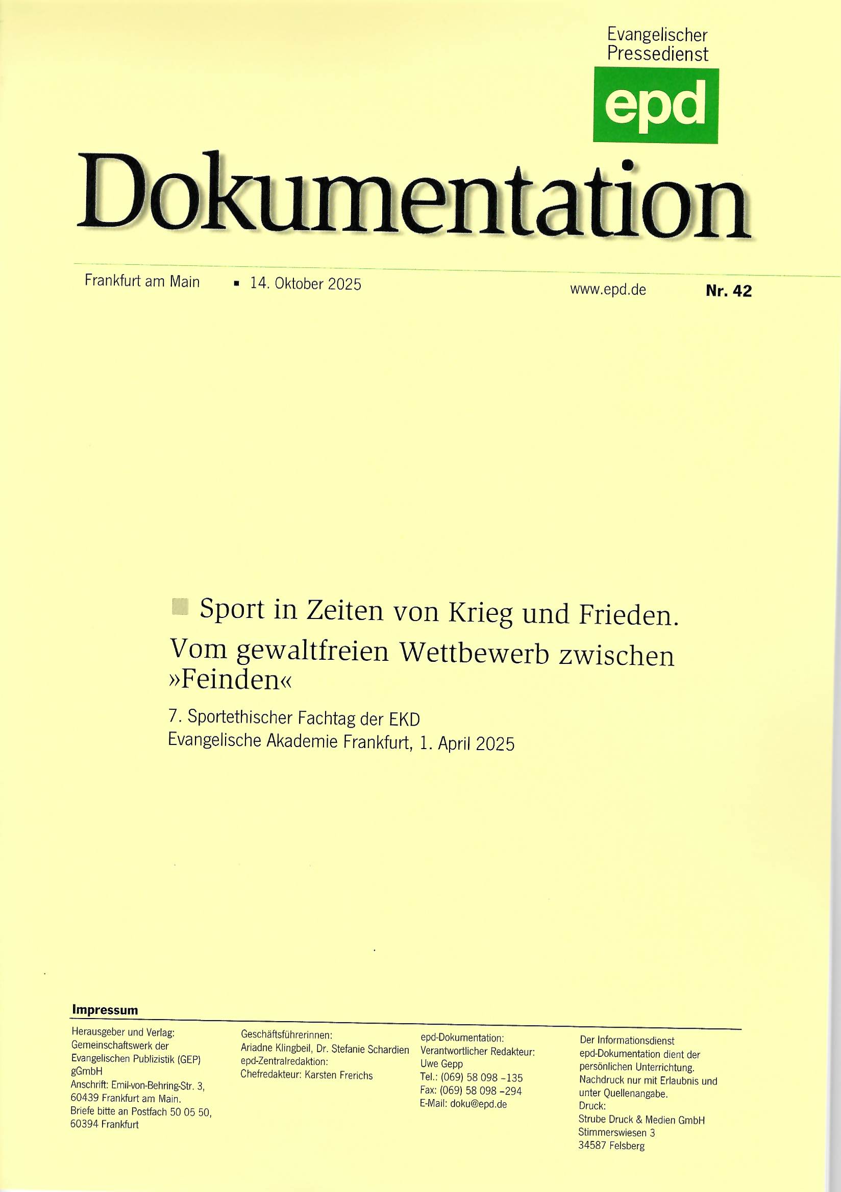 Woche für Woche präsentiert epd Dokumentation relevante Texte aus Kirche, Religion und Gesellschaft. Ergänzend zur journalistischen Tagesaktualität bietet die renommierte Publikationsreihe mit dem markanten gelben Umschlag einen fundierten Hintergrund für alle, die tiefer in Themen einsteigen wollen.